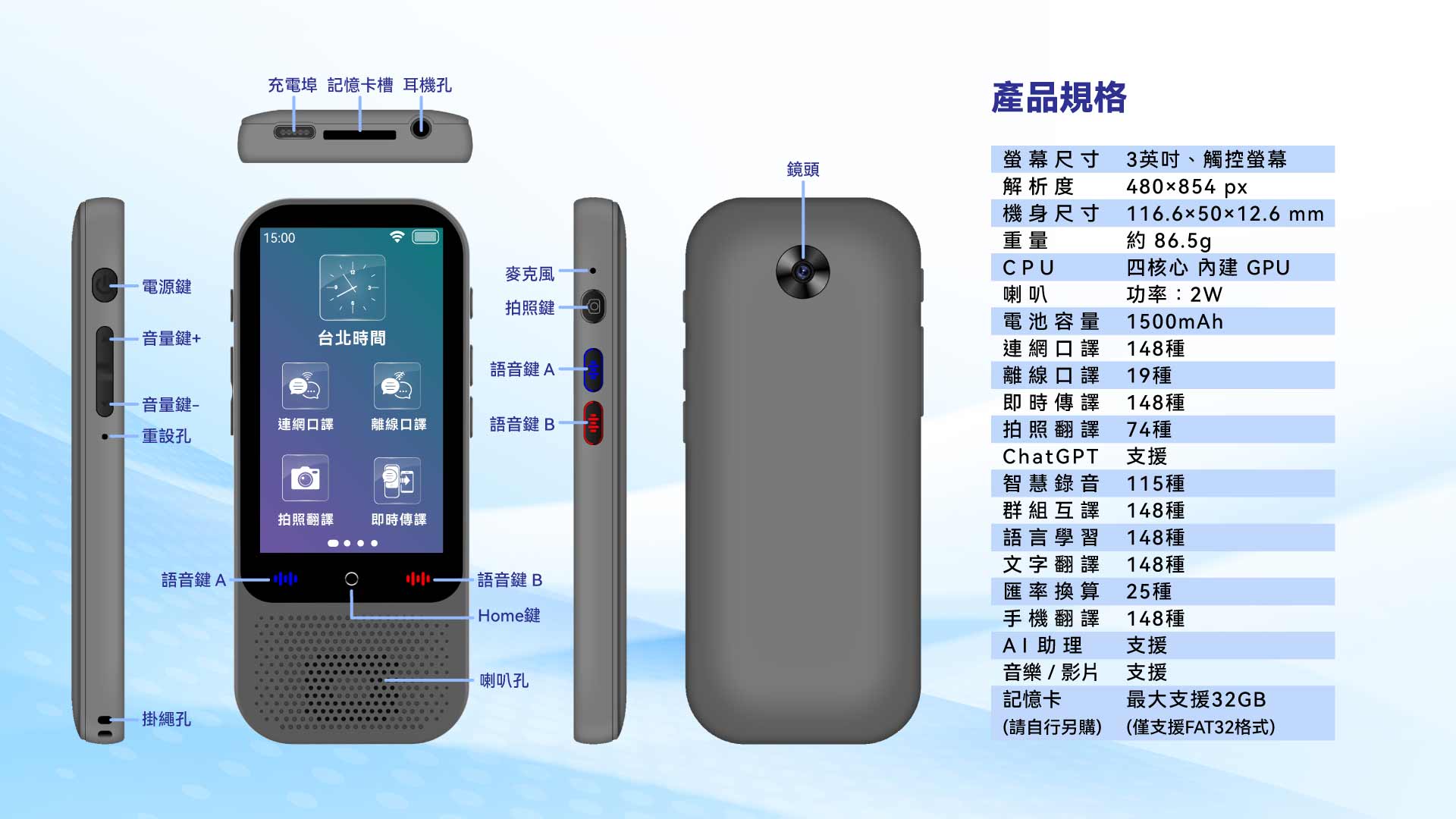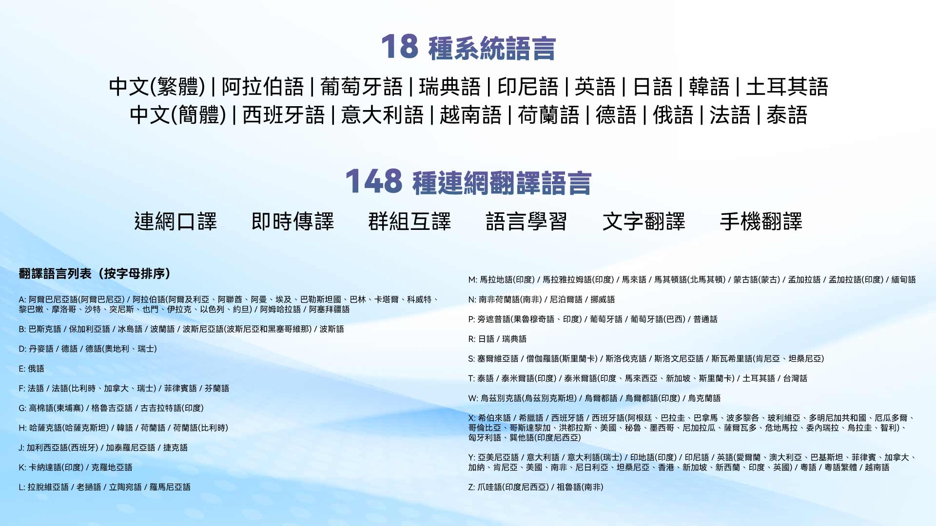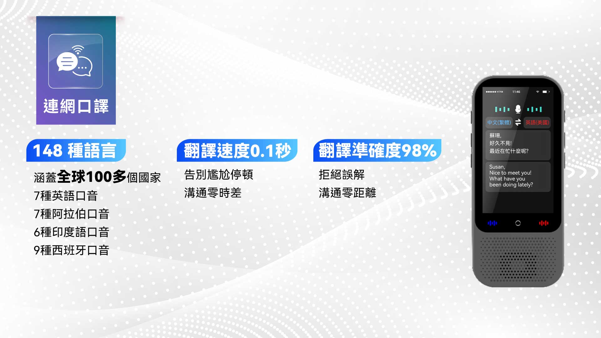 - 🌍 雙向即時翻譯:148種語言,連網說話即翻譯,溝通不卡頓