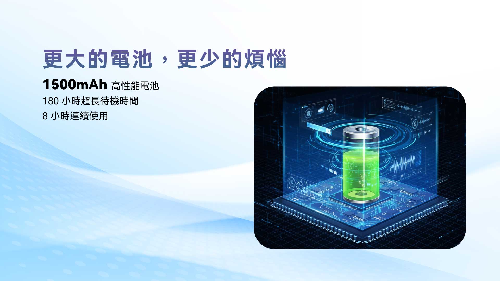 - 🔋 長效電池續航:1500mAh高性能電,8小時連續使用不斷電
